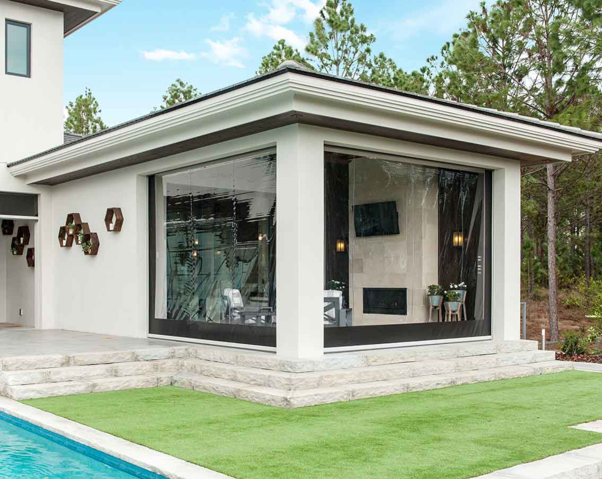 Keep your family from insects, shield your property from wind, rain, and sun, and reduce energy costs with efficient shades. On beautiful days, enjoy unobstructed views by retracting the shades, but when the weather shifts or you need extra privacy and security, simply lower them with the press of a button.